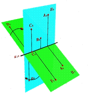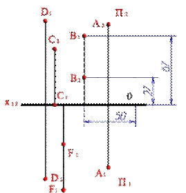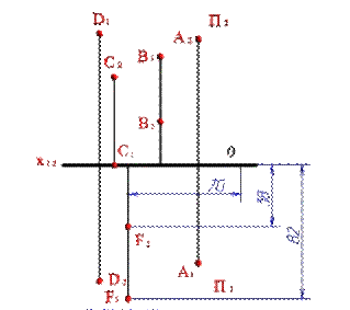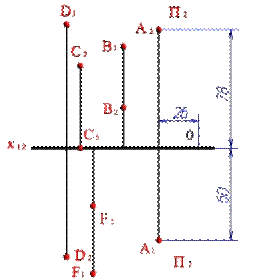 Проводим линии связи от проекций точек А, В, С, D и F до оси Х12 .
