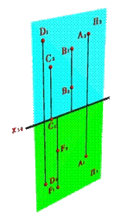 Проводим проецирующие лучи из точек А, В, С, D и F наплоскости П1 (горизонталь, зеленая) и П2 (фронталь, голубая).