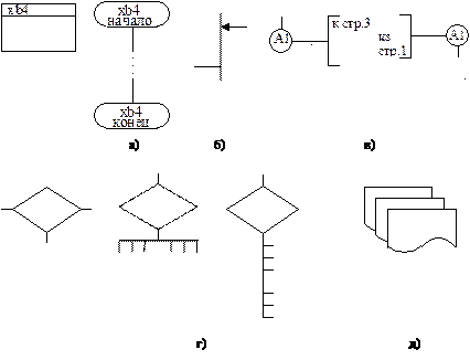 а - подробное представление; б - слияние линий; в - разрыв линий потока; г - несколько выходов из символа; д - повторяющиеся символы