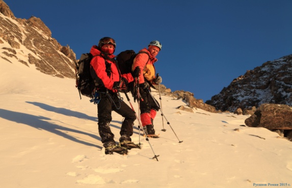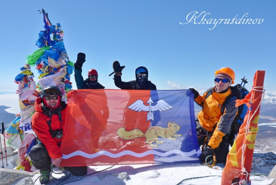 Утро этого дня началось прекрасно. Вышли на восхождение, дошли до озера Эхой, здесь пришлось остановиться. Погода испортилась, налетел снежный заряд, сильно упала видимость. Попытка переждать окончилась ничем. Попили чая и не солоно хлебавши отправились в базовый лагерь "ломать погоду". Всю ночь наши палатки терзал неслабый ветер, а наш сон - резко упавшая температура. Утро третьего дня принесло адский холод и чистое небо. Мы подгоняемые жаждой согреться, быстро собираемся и выходим на вторую попытку взойти на вершину. Снова дошли до озера Эхой, очень похожего на кратер вулкана или воронку от падения метеорита с почти идеально круглой формой. У кулуара привал, встали в связку. Несколько часов движения наверх, дошли до тросов, натянутых спасателями, еще усилие... В 10 часов утра мы на вершине священной горы Мунку-Сардык, высота-3491 метр. Отдаем дань памяти и уважения нашим ветеранам (наше восхождение приурочено к знаменательной дате - 70-летию Победы в Великой Отечественной войне), затем привязываем молитвенный флаг на триангуляционный знак, который уже обвешан сверху донизу всевозможными флагами и прочими культовыми