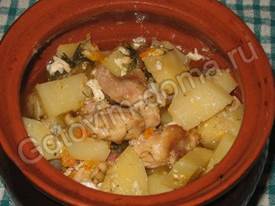 * можно кроме картофеля тушить мясо и с другими овощами, которые предварительно лучше немного обжарить. Можно добавлять грибы, стручковую фасоль (фасоль можно немного отварить), помидоры, баклажаны, кабачок и т.д. Можно добавить пропущенный через чесноковыжималку чеснок. Зелень можно добавлять непосредственно при подаче к столу. Курица, запеченная с картофелем