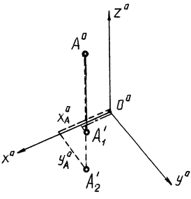 На рис. 8 обозначено: a — картинная (аксонометрическая) плоскость; Оx, Оy, Оz — натуральные (декартовы) оси координат; s — направление проецирования; jo — угол проецирования; Оx, Оy, Оz — проекции натуральных осей координат на картинную плоскость — аксонометрические оси; А o1 — аксонометрическая проекция точки А; А ’1 — вторичная проекция (горизонтальная) точки А. Для определения точки А на аксонометрической проекции (в аксонометрии) необходимо кроме аксонометрической проекции этой точки иметь ее вторичную проекцию, например, горизонтальную А 1, причем прямая А o А ’1 должна быть параллельна аксонометрической оси z o. Аксонометрическая проекция точки А и ее вторичная проекция А 1 (рис. 9) однозначно определяют положение точки в пространстве, что делает аксонометрическую проекцию обратимой. Если вторичная проекция не задана, ее можно будет задать произвольно, например, в точке А ’2, и тогда координаты x А, y А, z А изменяются.