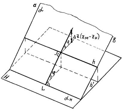 Рис. 65 Проведем в данной плоскости горизонталь h (рис. 66). Прямая n, перпендикулярная к прямой h, перпендикулярна и к следу плоскости aH (KL ^H) (рис.). Угол наклона прямой n к плоскости H определяется как угол между прямой и ее проекцией на плоскость H. Строим КК' ^H (рис. 66). Тогда угол j — искомый угол наклона прямой n к плоскости H. На рис. построена линия наибольшего наклона плоскости a к горизонтальной плоскости проекций — прямая n. Угол наклона плоскости a к плоскости H получают при определении натуральной величины отрезка КМ при построении прямоугольного треугольника по проекциям K'M' и K”.