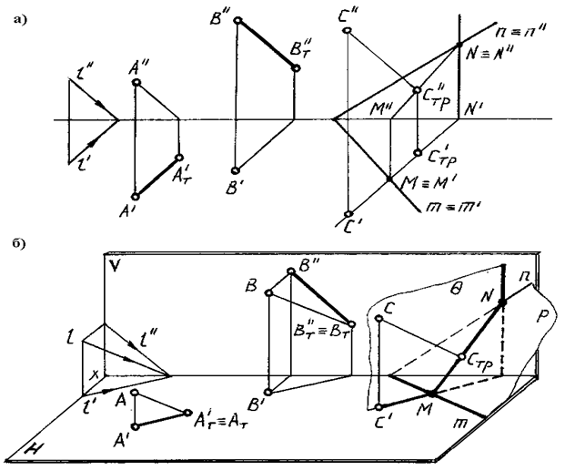 Рис. 75 Тень от точки А падает на плоскость Н в точке А Т' (эта точка является горизонтальным следом луча АА Т). Тень от точки В падает на плоскость V в точке B Т '' (эта точка является фронтальным следом луча АВ Т). Тень от точки в аксонометрии определяется в результате пересечения луча с его вторичной проекцией. Тень В T'' (в аксонометрии) можно построить как точку пересечения луча ВВ Т с его фронтальной проекцией В''B T '' или при помощи горизонтальной проекции луча. Тень от точки С падает на плоскость P (n ´ m) в точке С TP (С TP ', СTP ”), которая определяется в результате пересечения луча СС T с заданной плоскостью Р при помощи горизонтально-проецирующей плоскости Q.
