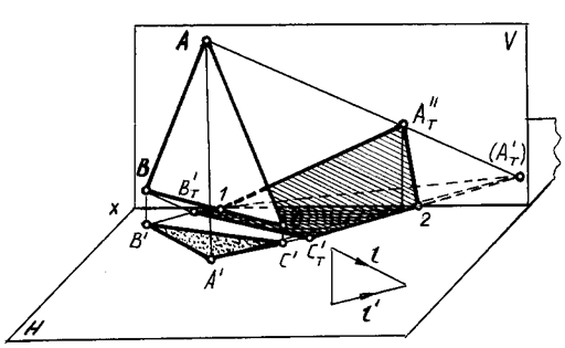 Рис. 82 Падающие тени от сторон АВ и АС можно построить при помощи промежуточных точек (как на чертеже 81) или при помощи мнимой тени (А T'), падающей от точки А на заднюю полуплоскость Н. Получив треугольник А TH В TH С TH, определяем на оси ОХ точки перелома 1 и 2 падающей тени и соединяем их с действительной тенью А TV от точки А на плоскости V. Сторона плоской фигуры, обращенная к теневому столбу, находится в тени, то есть у плоских фигур следует различать освещенную и неосвещенную стороны. Иначе говоря, плоская фигура всегда имеет собственную тень. Для выяснения освещенности сторон плоскости треугольника применяем следующий прием: обходя на исследуемой проекции периметр треугольника по часовой стрелке, замечаем порядок букв, обозначающих вершины, и сопоставляем с порядком букв, который получается при обходе по часовой стрелке контура падающей тени. Совпадение порядка букв обозначает, что на данной проекции видима освещенная сторона треугольника, несовпадение — что видима неосвещенная сторона плоскости. На рисунке контур падающей тени при его обходе по часовой стрелке дает порядок букв А T'' С T'' В T''. Такой же порядок (А '' С '' В '') получается на фронтальной проекции. Следовательно, на V видима освещенная сторона. Горизонтальная проекция имеет обратный порядок букв (А ' В ' С '). Это значит, что на горизонтальной проекции к нам обращена неосвещенная сторона плоскости треугольника (сторона, находящаяся в собственной тени). Этим же приемом можно пользоваться в аксонометрии (рис. 83).