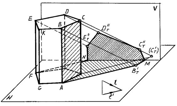 Рис. 90 Для определения контура собственной тени призмы необходимо установить освещенность ее граней. Так как боковые грани призмы перпендикулярны к плоскости Н, то их освещенность легко определить на горизонтальной проекции, где видно, что обращены к свету две грани: EFGK и KGAB. Освещено также верхнее основание призмы. Таким образом, контуром собственной тени является ломаная ABCDEFGA, от которой построена тень, падающая на плоскости H и V по правилам, изложенным в предыдущей теме. На рисунке 91,92 приведен пример построения собственной и падающей теней правильной пятиугольной пирамиды SABCDE.