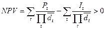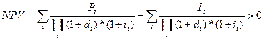В случае, если уровень инфляции не превышает 7% в год, то последнее слагаемое можно отбросить. Этот способ учета инфляции можно считать отражением инфляционных процессов в экономике как одного из видов недифференцированных рисков, когда имеет место общее, распространяющееся на все виды товаров и услуг повышение цен. В этом случае затраты и доходы в отдельные годы осуществления инвестиционной программы и задаваемые на стадии проектных обоснований, естественно, должны быть дисконтированы с учетом общих показателей инфляции. Но при этом, используя указанную выше формулу, мы сталкиваемся со следующим явлением: по мере удаления от начального момента осуществления инвестиций влияние инфляции оценивается как все более и более существенное. Кроме того, показатели, содержащиеся в указанной формуле, принимаются как константы, и в таком виде их допустимо использовать только при оценке эффективности краткосрочных программ. Но при инвестиционной стратегии, рассчитанной на длительный срок, значения WACC? т.е. d и i, могут меняться при изменении цены отдельных инвестиционных ресурсов и темпов инфляции. Для долгосрочных расчетов поэтому необходимо использовать величины Но это значит, что и сама структура формулы определения NPV должна поменяться. С учетом того, что d и i рассматриваются не как константы, а как переменные величины, эта формула приобретает следующий вид: