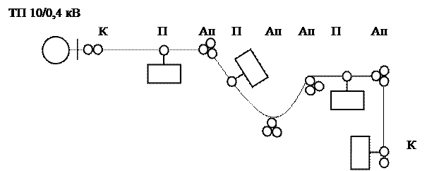 Рисунок 6.1 - Схема траси повітряної ліній і типи встановлених опор