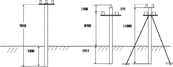 Для спорудження ліній електропередавання напругою до 1 кВ можуть застосовуватися залізобетонні, дерев'яні, дерев'яні із залізобетонними приставками і металеві опори. 6.3.1 Типи опор Для спорудження ліній слід застосовувати такі типи опор: 1) проміжні опори, які встановлюються на прямих ділянках траси; ці опори в нормальному режимі роботи не сприймають зусиль, спрямованих уздовж лінії; 2) анкерні опори, які встановлюються для обмеження анкерного прогону, а також у місцях зміни кількості, марок і перерізу проводів. Ці опори повинні сприймати в нормальному режимі роботи зусилля від різниці натягу проводів, спрямованого вздовж лінії; 3) кутові опори, які встановлюються в місцях зміни напрямку траси лінії. Ці опори в нормальному режимі роботи повинні сприймати сумарне навантаження від натягу проводів суміжних прогонів. Кутові опори можуть бути проміжного та анкерного типів; 4) кінцеві опори, які встановлюються на початку і в кінці лінії, а також у місцях кабельних вставок. Ці опори є опорами анкерного типу і повинні сприймати в нормальному режимі роботи односторонній натяг усіх проводів; 5) відгалужувальні опори, на яких здійснюються відгалуження від лінії; 6) перехресні опори, на яких здійснюється перетин ліній двох напрямків. Відгалужувальні і перехресні опори можуть бути всіх зазначених вище типів. Конструкція опор повинна забезпечувати можливість установлення: - ліхтарів вуличного освітлення всіх типів; - кінцевих кабельних муфт; - секціонувальних і комутаційних апаратів; - шаф і щитків для приєднання електроприймачів. Крім того, усі типи опор за конструкцією повинні допускати можливість здійснення одно- і трифазних відгалужень до вводів у будівлі (споруди) довжиною до 25 м. Опори незалежно від їх типу можуть бути вільностоячими, з підкосами або відтяжками. Відтяжки опор повинні прикріплюватися до анкерів, установлених у землі, або до кам'яних, цегельних, залізобетонних і металевих елементів будівель і споруд. Вони можуть бути одно- або багатодротовими. Переріз відтяжок визначається розрахунком. Переріз однодротових сталевих відтяжок повинен бути не менше ніж 25 мм2. Опори повинні розраховуватися за методом граничних станів відповідно до чинних державних стандартів і норм для умов нормального режиму роботи лінії і кліматичних умов відповідно до 2.4.10. Проміжні опори розраховуються на одночасну дію поперечного вітрового навантаження на проводи і конструкцію опори без ожеледі або покриті ожеледдю. Допускається враховувати відхилення опори під дією навантаження. Кутові опори (проміжні та анкерні) розраховуються на результуюче навантаження від натягу проводів і вітрового навантаження на проводи і конструкцію опори. Анкерні опори розраховуються на різницю натягу проводів суміжних прогонів і поперечне навантаження від тиску вітру за ожеледі і без ожеледі на проводи і конструкцію опори. За мінімальне значення різниці натягу необхідно приймати 50% найбільшого значення одностороннього натягу всіх проводів. Кінцеві опори розраховуються на односторонній натяг усіх проводів. Відгалужувальні опори розраховуються на результуюче навантаження від натягу всіх проводів. У випадку встановлення опор на затоплюваних ділянках траси, де можливі розмиви ґрунту або льодохід, опори повинні бути укріплені (підсипка землі, замощення, улаш