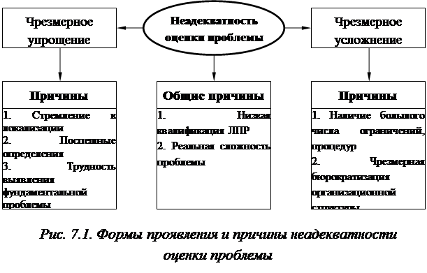 Лекция 7. Анализ проблемы и выработка альтернатив Основные понятия: неадекватность оценки проблемы; отклонение неплодотворных идей; понимание проблемы; элементы понимания проблемы; стадии понимания проблемы; сбор данных; анализ и интерпретация данных; методы сбора данных; анализ вход-выход; диаграмма процесса; методы анализа информации; причинно-следственная диаграмма; анализ почему-почему; спектр альтернатив; методы активизации; творческий потенциал; творческий потенциал индивида; творческое поведение; преграды творчеству; творческие личности; творческий потенциал личности; конфликтность и противоречивость; самопонимание; выдвижение идей; выявление взаимосвязей; творческие организации; передача полномочий и ответственности; процесс потери контроля; система делегирования полномочий; консервативное управление; характеристики нетворческой деятельности; условия творчества; метод творческого потенциала; аналитические методы; этапы применения метода; метод аналогии; типы аналогий; персональная, прямая, символическая и воображаемая аналогия; групповые методы; «мозговой штурм»; метод Гордона; номинальный групповой метод; метод принудительных связей; морфологический анализ; надежность методов; мотивация. Одна из наиболее трудных стадий в решении проблемы – переход от ощущения дискомфорта, от ситуации, где «что-то причиняет вред», к той, в которой мы имеем четко сформулированную проблему. Стремление к ясному пониманию проблемы может часто вести к ее неадекватной оценке. Такая неадекватность может иметь две крайности: чрезмерно упрощенное, либо напротив, чрезмерно усложненное представление реальной проблемы (рис.7.1).