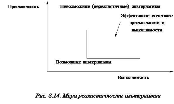 Выбор стандарта Любая альтернатива может быть оценена различно – в зависимости от выбранного стандарта. При оценке возможности и целесообразности инвестиций одна из альтернатив имеет более высокую чистую текущую стоимость, чем у инвестиций, ранее осуществленных нашей организацией. В то же время эта стоимость будет лишь приемлемой по сравнению с уровнем чистой текущей стоимости инвестиций такого рода у других компаний, занимающихся таким же видом деятельности. И этот уровень будет довольно низким по сравнению с тем, что мы надеемся получить в данных условиях. Однако такая инвестиция обеспечивает получение результата, более предпочтительного по сравнению с вариантом отказа от осуществления этой и других альтернатив. Оценка выполнимости альтернатив включает сравнение вариантов с определенным стандартом, а также сравнение вариантов между собой. В фазе оценки определяются базовые атрибуты вариантов решений, которые могут быть использованы как основа для сравнения. Необходимо разделение факторов, которые определяют уровень выполнимости каждого варианта и обусловливают приемлемость того или иного варианта. На рис. 8.14 представлены основные характеристики меры реалистичности альтернатив.