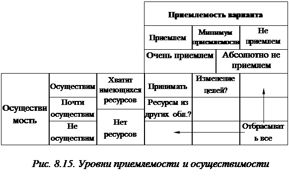 Приемлемость варианта означает степень удовлетворения данного варианта всем целям решения. Один полюс в спектре альтернатив представлен вариантами, которые полностью удовлетворяют всем целям. На другом полюсе находятся альтернативы, которые не удовлетворяют ни одной цели. Между двумя крайними полюсами располагаются варианты, которые могут удовлетворять различным целям в различной степени. Именно в этой промежуточной области ЛПР сталкивается со всеми проблемами осуществления выбора варианта по множеству критериев. В какой-то точке данной последовательности альтернатив можно определить понятие «минимального уровня приемлемости» для данного решения. Это понятие может быть представлено одной или несколькими точками в последовательности, которая будет отделять приемлемое от неприемлемого. Скорее это будет ряд, внутри которого лежат различные варианты минимальной приемлемости. Выполнимость варианта определяет вероятность того, что организация имеет или может получить необходимые ресурсы для осуществления этого варианта. Существует последовательность вариантов, для которых достаточно ресурсов, уже имеющихся у организации. Другая последовательность вариантов потребует ресурсов, которые организация в состоянии приобрести. Наконец, часть ресурсов, которые необходимы для реализации альтернативы, отсутствуют у организации и не могут быть приобретены. Здесь, как и в оценке приемлемости, сложно четко разграничить осуществимость и неосуществимость определенного варианта. Но в отличие от шкалы приемлемости многокритериальный выбор вызовет затруднения, так как для осуществимости варианта все требуемые ресурсы должны быть доступны. Здесь проблема заключается в неопределенности, которая вытекает из двух моментов. Во-первых, решение, возможно, не определяет точно, какой вид ресурсов потребуется и в каком количестве. Во-вторых, нельзя быть уверенным, что все требуемые ресурсы будут доступны вовремя. Все варианты, которые в полной мере приемлемы либо осуществимы, должны оцениваться дальше (рис.8.15). Любые варианты, которые не только не осуществимы, но и не приемлемы, должны отбрасываться без дальнейшего рассмотрения. Варианты, которые приемлемы, но не осуществимы, или осуществимы, но не приемлемы, должны отбрасываться, хотя это и не так просто, как кажется.