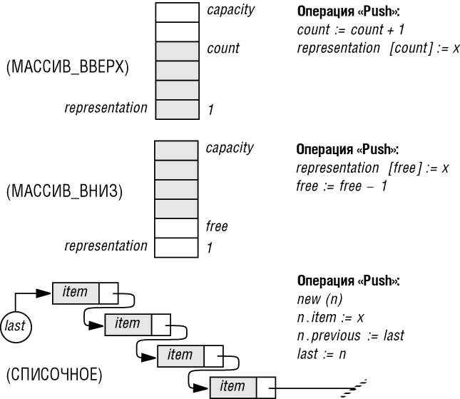 Рядом с каждым представлением на рисунке приведен фрагмент программы (в духе Паскаля), с соответствующей реализацией основной стековой операции: втолкнуть элемент x на вершину стека (push). Для представлений с помощью массивов МАССИВ_ВВЕРХ и МАССИВ_ВНИЗ команды увеличивают или уменьшают указатель на вершину (count или free) и присваивают x соответствующему элементу массива. Так как эти представления поддерживают стеки с не более чем capacity элементами, то корректные реализации должны содержать защищающие от переполнения тесты соответствующего вида: if count " capacity then... if free " 0 then..., (на рисунке они для простоты опущены). Для представления СПИСОЧНОЕ вталкивание элемента требует четырех действий: