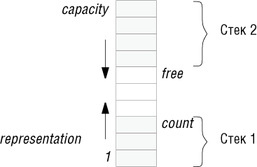 Хотя эти представления встречаются чаще всего, существует и много других представлений стеков. Например, если вам нужны два стека с однотипными элементами и память для их представления ограничена, то можно использовать один массив с двумя метками вершин count как в представлении МАССИВ_ВВЕРХ и free как в МАССИВ_ВНИЗ. При этом один стек будет расти вверх, а другой - вниз. Условием полного заполнения этого представления является равенство count= free. Преимущество такого представления состоит в уменьшении риска переполнить память: при двух массивах размера n, представляющих стеки способом МАССИВ_ВВЕРХ или МАССИВ_ВНИЗ, память исчерпается, как только любой из стеков достигнет n элементов. А в случае одного массива размера 2n, содержащего два стека лицом к лицу, работа продолжается до тех пор, пока их общая длина не превысит 2n, что менее вероятно, если стеки растут независимо друг от друга. (Для любых переменных p и q, max (p +q) "= max (p) + max (q)).