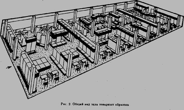 Рис. 2. Общий вид зала товарных образцов Товарные образцы выставляются таким образом, чтобы покупатели могли свободно ориентироваться в предложенном им ассортименте. Зона ожидания и отдыха предназначена для самостоятельной работы покупателей с альбомами, каталогами и списками товаров, а также для их отдыха после отбора товаров. Желательно, чтобы эта зона была отделена от основной экспозиции товаров и рабочих мест товароведов-реализаторов. Основное оборудование зоны ожидания и отдыха – журнальные столы, кресла или банкетки, цветочницы. Здесь же могут быть сосредоточены различные рекламные материалы (листовки, проспекты, каталоги) и другая информация о реализуемых товарах, нормативно-техническая документация (стандарты и т. д.). Таким образом, зона ожидания и отдыха может быть совмещена с зоной информации. Зона проходов служит для передвижения в зале товарных образцов и для прохода в другие помещения оптовой базы. Основные проходы должны иметь ширину не менее 2 м, другие – не менее 1 м. Организация функциональных зон в зале товарных образцов, их обособленность решаются с помощью подбора и расстановки торгового оборудования и мебели, размещение которых должно отвечать не только функциональной целесообразности, но и благоприятному восприятию интерьера. Общий вид зала товарных образцов, разделенного на укрупненные функциональные зоны, представлен на рис. 2.