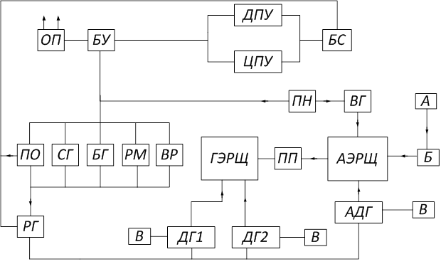 Блок управления (БУ) обеспечивает автоматическое и дистанционное автоматизированное (с поста управления судном ДПУ или ЦПУ) подключение генераторов на шины ГЭРЩ и отключение их от шин. Аварийный (АДГ), основной (ДГ1) и резервный (ДГ2) дизель-генераторы снабжены устройством, обеспечивающим их автоматический пуск и остановку (ПО). Оно готовит дизель-генератор к пуску: подает питание пусковым системам; включает подачу воздуха к пусковым клапанам; прокачивает смазочную систему, подогревает воду и масло, контролирует пуск; останавливает агрегат и подает соответствующие сигналы об исполнении команды в блок сигнализации (БС) на посту управления судном или ЦПУ. С отсутствием напряжения на шинах ГЭРЩ блок ПО осуществляет автоматический пуск и подключение резервного дизель-генератора ДГ2. При параллельной работе дизель-генераторов блок автоматической синхронизации генераторов (СГ) осуществляет их автоматическую синхронизацию (равенство э.д.с. включенного генератора и напряжения на шинах ГЭРЩ, равенство частоты э.д.с. и частоты тока на шинах электростанции, совпадение фаз э.д.с. и напряжения, одинаковый порядок чередования фаз генератора). При отсутствии синхронизации устройство автоматической блокировки генераторов (БГ) предотвращает включение генератора на шины ГЭРЩ, а блок автоматического регулирования мощности (РМ) автоматически распределяет активную нагрузку (мощность) между генераторами. При наличии валогенератора (ВГ) средства автоматизации СЭС осуществляют автоматическое переключение нагрузки (ПН) с валогенератора на дизель-генератор и обратно с перерывом в питании ответственных потребителей не более 3 с. В случае загрузки основного (основных) генераторов на 85-90% блок автоматического включения резерва (ВР) осуществляет автоматический пуск и подключение на шины ГЭРЩ резервного дизель- генератора, а блок ОП при перегрузке СЭС (на судах мощностью более 440кВт) может автоматически отключить несоответственные потребители от шин ГЭРЩ, а также автоматически включить их после исчезновения перегрузки. При снижении нагрузки в сети до 30-45% блок автоматической разгрузки генераторов (РГ) с поста управления судном или ЦПУ автоматически выключает и выходит в резерв в зависимости от числа одновременно работающих один или несколько генераторов. На случай выхода из строя основной электростанции суда оборудуют аварийными источниками энергии: аварийными дизель-генераторами (ДГ) или аккумуляторными батареями (Б). Аварийный электрораспределительный щит (АЭРЩ) связан блоком автоматического переключения питания (ПП), который допускает подачу питания только в одном направлении — от ГРЭЩ к АЭРЩ. Аккумуляторные батареи заряжаются от навешенных на дизели зарядных агрегатов или от автоматических зарядных устройств, например, выпрямительных кремниевых зарядных устройств. Защита генераторов от перегрузок и токов короткого замыкания осуществляется автоматическими выключателями (В).