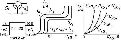 1) Схема включения транзисторов с общей базой (ОБ) (рис. 3.5 а): выходная характеристика отражает зависимость тока коллектора от напряжения на коллекторе относительно базы при фиксированном токе эмиттера (рис. 3.5 б)