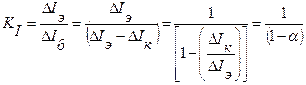 Входное сопротивление схемы с общим коллектором очень велико (порядка десятков и сотен кОм), а выходное сопротивление, наоборот, мало и составляет лишь десятки или сотни Ом. Поэтому каскад с общим коллектором имеет коэффициент усиления по напряжению меньше единицы, а усиление по мощности несколько меньше коэффициента усиления по току. Данная схема служит, в основном, для согласования сопротивлений между отдельными каскадами усилителя или между выходом усилителя и низкоомной нагрузкой. В схемах с общим коллектором входным током, как и в схемах с общим эмиттером, является ток базы, а выходным током – ток эмиттера. Поэтому коэффициент усиления по току для этой схемы может быть найден по формуле
