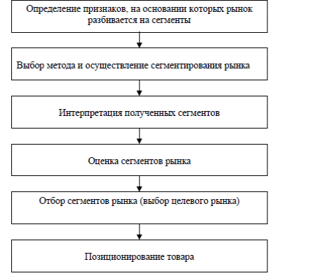 5.1 Понятие сегментирования рынка. 5.2 Этапы процесса сегментирования рынка. 5.3 Основные подходы к сегментированию рынка 5.4 Оценка сегментов рынка. 5.5. Отбор сегментов рынка. 5.6 Позиционирование. 5.1. Понятие сегментирования рынка Сегментирование (сегментация) рынка – это его разделение на отдельные сегменты, различающиеся возможностями сбыта товара производителя. Сегмент рынка – это часть рынка, группы потребителей продуктов, обладающих определенными сходными признаками и существенно отличающихся от всех других групп и секторов рынка. Сегмент рынка – группа потребителей, одинаково реагирующих на один и тот же предлагаемый продукт и на комплекс маркетинга. Сегмент рынка– это крупная, идентифицируемая по каким-либо признакам (сходные потребности, покупательская способность, регион проживания, потребительские приоритеты и привычки) группа покупателей. Сегмент рынка состоит из потребителей, одинаково реагирующих на один и тот же набор побудительных стимулов маркетинга. Цель сегментирования – выявить у каждой группы покупателей сравнительно однородные потребности в товаре (услуге) и в соответствии с этим ориентировать товарную, сбытовую политику организации. Выделенные сегменты должно быть: 1. определенными, т. е. иметь четкий набор потребностей и реагировать схожим образом на предлагаемый товар (услугу); 2. достаточно существенными по размеру; 3. доступными для маркетинговой деятельности; 4. количественно измеряемыми; 5. используемыми в течение длительного периода времени. Виды сегментирования в зависимости от характера ее проведения, от типа потребителей товаров/услуг: – макросегментация рынка – рынки делятся по регионам, степени их индустриализации и т. д.; – микросегментация – формирование групп потребителей (сегментов) одной страны, региона по более детальным признакам (критериям); – сегментация вглубь – процесс сегментации начинают с широкой группы потребителей, а затем поэтапно углубляют ее в зависимости от классификации конечных потребителей товара или услуги; – сегментация вширь – начинается с узкой группы потребителей, а затем расширяется в зависимости от сферы назначения и использования товара; – предварительная сегментация – начальный этап маркетинговых исследований, ориентирующий на изучение максимально возможного числа рыночных сегментов; – окончательная сегментация – завершающая стадия анализа рынка, проведение которой регламентируется возможностями самой фирмы и условиями рыночной среды. Задача первого этапа, называемого макросегментацией, заключается в идентификации «рынков товара», тогда как на втором этапе, называемом микросегментацией, ставится цель выявить внутри каждого ранее идентифицированного рынка «сегменты» потребителей. Целевой сегмент рынка – один или несколько сегментов конкретного рынка, наиболее существенных для маркетинговой деятельности. При выборе целевых сегментов руководители компании решают, сконцентрируют ли они усилия на одном секторе или на нескольких, на отдельном товаре (рынке) или на массовом рынке. Фирма может предпочесть обратиться ко всему рынку или сфокусироваться на одном или нескольких специфичных сегментах в пределах своего базового рынка. 5.2 Этапы процесса сегментирования рынка Процесс рыночного сегментирования представлен на рис. 5.1.