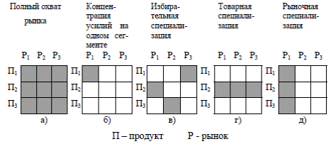 В процессе отбора сегментов рынка используются следующие виды стратегий: 1. Стратегия массового маркетинга (полного охвата рынка): одна продуктовая концепция предлагается большинству потребителей рынка, всем его сегментам. Существует риск того, что лишь немногие потребители будут полностью удовлетворены (рис. 5.2, а). 2. Стратегия одного сегмента: концентрация усилий на одном сегменте в рамках одной концепции. Относительно дешевый вариант в плане ресурсов, но очень рискованный, если сегмент не оправдает ожиданий (рис. 4.2, б). 3. Стратегия нескольких сегментов: для каждого из нескольких сегментов предлагается своя продуктовая концепция. Данный подход снижает риск, распределяя его по нескольким сферам обслуживания, однако может требовать очень много ресурсов. Включает: − избирательную специализацию, когда фирма выбирает несколько сегментов, привлекательных с точки зрения поставленных целей и имеющихся ресурсов (рис. 5.2, в); − товарную специализацию, когда фирма концентрирует усилия на выпуске одного товара, который предлагает нескольким сегментам рынка (рис. 5.2, г); − рыночную специализацию, когда фирма сосредотачивается на удовлетворении различных потребностей выбранной группы потребителей (рис. 5.2, д).