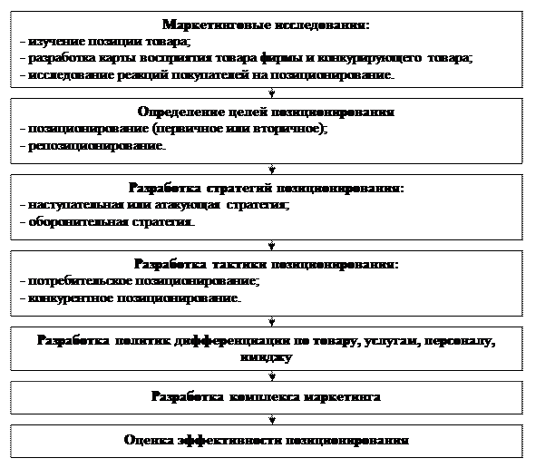 Цель позиционирования – анализ оценок покупателей относительно параметров продукта, для того чтобы осуществить их оптимизацию в соответствии с требованиями рынка и соответственно создать такую позицию товара, которая обеспечит продукту конкурентные преимущества на данном сегменте целевого рынка. Правильно организованное позиционирование рынка является предпосылкой эффективной разработки комплекса и плана маркетинга. Факторами, определяющими позицию товара на рынке, являются: цены, скидки, качество, производитель, дизайн, обслуживание, имидж товара, соотношение этих факторов. Процесс позиционирования представлен на рис. 5.3. Рассмотрим этапы позиционирования. I этап. Маркетинговые исследования Основой позиционирования являются результаты маркетинговых исследований, в зависимости от целей предприятия определяются их направления и содержание, которое, в свою очередь, предопределяет использование соответствующих методов: экспертных оценок, рыночного тестирования, опрашиваний и др. По результатам маркетинговых исследований разрабатываются карты – схемы восприятия товаров, которые характеризуют наилучшие комбинации потребительских преимуществ при выборе товара. Карта – схема восприятия товаров представляет собой матрицу, построенную на основе различной совокупности параметров – от двумерной (например, цена/качество) до многомерной (используется метод многомерного шкалирования потребительских восприятий и преимуществ).