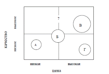 Рисунок 5.4 – Карта – схема восприятия товара по параметрам цена/качество Ориентация на укрепление в сознании потребителей позиции товаров предприятия означает стремление предприятия к укреплению текущей позиции товара, то есть вторичного позиционирования. Первичное и вторичное позиционирование базируются на одних и тех же отличительных характеристиках товаров предприятия. Если предприятие стремится проникнуть в новые потребительские сегменты или на новый рынок, то его целью становится репозиционирование. III этап. Разработка стратегий позиционирования Различают две стратегии позиционирования: наступательную и оборонительную. Наступательная или атакующая стратегия связана с управлением товарным ассортиментом. При расширении ассортимента увеличивается доля рынка за счет части рынка, которая раньше занималась конкурентами, усложняется вывод на рынок товаров конкурентов, усиливаются конкурентные позиции предприятия. Но расширение ассортимента усиливает конкуренцию между собственными разновидностями товаров, которая сопровождается возрастанием затрат как в целом, так и на маркетинг. Оборонительная стратегия позиционирования называется еще стратегией “крепость на острове”. Ее сущность состоит в том, что разновидности товара (или марки), которые позиционируются как дорогие и высококачественные, ограждаются от ценовой конкуренции более дешевыми товарами, предназначенными для покупателей, чувствительных к цене. IV этап. Разработка тактики позиционирования Избранная стратегия предопределяет необходимость разработки соответствующей тактики позиционирования. Вообще все тактические мероприятия можно разделить на две группы: потребительское позиционирование и конкурентное позиционирование. Потребительское позиционирование – это позиционирование, которое базируется на учете потребительской ценности и ориентируется на достижение предприятием определенного уровня удовлетворения ожиданий потребителей. Потребительское позиционирование охватывает информационное позиционирование и позиционирование с помощью создания имиджа. Информационное позиционирование основано на детальной информации о товарах предприятия. Оно охватывает следующие типы позиционирования: − позиционирование, основанное на отличительных преимуществах товара; − позиционирование, основанное на удовлетворении специфических потребностей; − позиционирование, основанное на специфике использования; − позиционирование, ориентированное на определенную категорию потребителей; − позиционирование, основанное на стиле жизни и прочее. Позиционирование с помощью создания имиджа основано не на конкретной, а на общей информации о товаре, которая может восприниматься потенциальными покупателями по разному, но оно разрешает потребителю увидеть в товаре почти любое желательное преимущество. Оно может осуществляться как с помощью создания стойких представлений о предприятии и ее товарах, так и через позиционирование, основанное на выгодах, которые предоставляются предприятием, или на решении проблемы. Конкурентное позиционирование ориентировано на демонстрацию отличительных преимуществ предприятия или за счет предложения товаров и услуг по более низким ценам, или за счет предоставления потребителям больших преимуществ в с