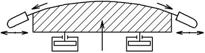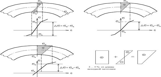Из этих выражений следует, что факторами, определяющими величину пружинения, выступают R0 и Δσ = σн – σв и можно сделать практические выводы о способах повышения точности гибки или уменьшения пружинения. Таких способов три: а) применять при гибки подогрев, значительно улучшающий пластические свойства материала, но резко ухудшающий технико-экономические показатели процесса; б) определить величину ΔR и гнуть с учетом этой величины на меньший радиус. Способ, хотя и применяется, не очень хорош, так как разброс прочностных характеристик в различных партиях плавки материала в пределах допуска на отклонение механических свойств не позволяет получить достаточной (стабильной) точности определения ΔR; в) применять гибку с растяжением, уменьшая величину Δσ, а, следовательно, и пружинение — способ дает удовлетворительную точность и часто применяется на практике (рис. 2).