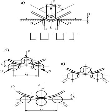 Рис.4. Способы гибки: а) — в универсально-гибочном штампе, б), в), г) — гибка прокаткой