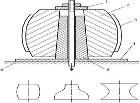 Рис. 7. Кольцевая обтяжка: 1 – верхняя плита, 2 – секции разжимного пуансона, 3 – заготовка, 4 – опорная плита, 5 – конус, 6 – стол станка . Как всякий процесс, обтяжка имеет свои ограничения, определяемые степенью деформации того или иного материала, которую он может претерпевать без разрушения. За меру деформации принимают коэффициент обтяжки К обт, представляющий собой отношение длины наиболее растянутого волокна после обтяжки L д к его первоначальной длине L, т.е.