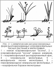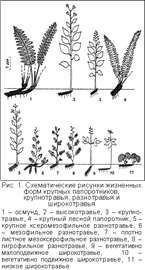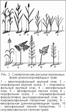 По форме листьев злаки и осоки существенно отличаются от "разнотравья", иной характер фотосинтетического аппарата имеют хвощи и папоротники. По продолжительности жизни листьев различаются растения с однолетними листьями, с перезимовывающими листьями и с дву-многолетними листьями ("вечнозеленые"). По теневыносливости листового аппарата можно различать растения светолюбивые, средне-теневыносливые и глубоко-теневыносливые. По консистенции листа выделяются травы с нежными листьями, с обычными листьями, жестколистные и толстолистные. По размерам надземных вегетативных органов различаются травы крупные (выше 0,5 м), средние (0,15-0,5 м) и низкие (меньше 0,15 м). По характеру побегов и способности к вегетативному разрастанию травы можно подразделить на вегетативно малоподвижные, дерновинные, длиннокорневищные и ползучие. Все кустарнички во флоре Дальнего Востока – вегетативно подвижны. Сопоставление сходства по всем признакам позволило выделить четко очерченные экологические группы и дать им среднюю групповую характеристику по тем же признакам. Для сопоставления использовались также обычные качественные градации по отношению растений к влажности и пищевому режиму почв. Эколого-морфологические классы. По совокупности признаков с дополнительным учетом эколого-ценотических и биологических особенностей видов выделены наиболее четкие группы жизненных форм. В одну группу выделились высокотравье, крупнотравье и крупные папоротники. Можно также отметить близость к лесо-луговому разнотравью вегетативно малоподвижного широкотравья и крайних по отношению к влажности почв "разнотравных" видов. Отчетливо обособились рыхлодерновинные лесные осоки, таежное мелкотравье, длиннокорневищные папоротники и таежные кустарнички. 1. Высокие и крупные гигромезофильные и мезофильные травы и папоротники („крупнотравье", высокотравье) – результат адаптации к богатым влажным почвам в условиях лугов или разреженных лесов. Формируемый травяной покров отличается мощным развитием, высокой сомкнутостью и значительной устойчивостью, в связи с чем большинство особей в течение ряда лет занимает лишь свое место. Хорошее развитие получают как подземные, так и надземные органы. У многих представителей ортотропные высокие стебли и крупные листья. 2. Вегетативно малоподвижные мезофильные травы средних размеров ("разнотравье"), приспособленные к сообитанию в сомкнутом травостое на суходольных, довольно богатых почвах. Меньшее плодородие и некоторая сухость почв объясняют уменьшение размеров растений. В класс разнотравья входит и широкотравье. 3. Длиннокорневищные крупные и средних размеров травы местообитаний с неустойчивыми почвенными условиями или переменной ценосредой (например, под пологом леса). Почвенные условия достаточно благоприятны, о чем свидетельствуют значительные размеры растений, но пригодность местообитаний для длительного существования растений на одном месте постоянно нарушается. Группа включает растения серийных луговых, лугово-болотных группировок или травяного покрова лесов на среднебогатых почвах. Данная группа объединяет очень пестрый набор жизненных форм. 4. Рыхлодерновинные невысокие травы ("осочки") – доминанты травяного покрова на свежих, часто суховатых почвах. Конкуренция со стороны других жизненных форм т