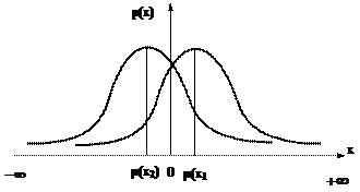 Выражение (6.6) является математическим ожиданием для дискретных случайных величин при условии, что N равно всем значениям данной случайной величины. Математическим ожиданием называется средневзвешенное значение случайной величины, если оно вычисляется по всем значениям, которые может принимать данная случайная величина. Поскольку все значения случайной величины называются ее генеральной совокупностью, то математическое ожидание является генеральным средним, т.е. средним по генеральной совокупности. Математическое ожидание характеризует положение центра распределения случайной величины. На рисунке 6.5 показаны два распределения с разными математическими ожиданиями μ(х1) > μ(х2):