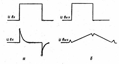 откуда следует, что интегрирование входного напряжения uвх тем точнее, чем меньше uвых по сравнению с u вх, как и в случае дифференцирующих цепей. Анализ показывает, что для интегрирующих цепей это условие выполняется, когда постоянная времени τ значительно больше длительности входного сигнала или его интегрируемой части. Для uвх, представляющего собой идеальный прямоугольный импульс, выходное напряжение дифференцирующих цепей имеет вид двух коротких импульсов, соответствующих фронту и срезу импульса (см. рис. 2.30,а), выходное напряжение интегрирующих цепей имеет форму треугольных импульсов, нарастающая и спадающая части которых приблизительно линейны (см. рис. 2.30,б).