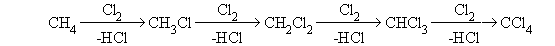 Галогенирования алканов протекает при УФ-облучении или высокой температуре по схеме: RH + Hal2 ® RHal + HHal Hal=Cl, Br. Реакционная способность галогенов по отношению к алканам уменьшается в ряду: F2 >Cl2 >Br2 >I2 Фторирование в обычных условиях приводит к полному разрушению органической молекулы. Иод с алканами не взаимодействует. Реакции галогенирования протекают по цепному радикальному механизму, который включает следующие стадии: Инициирование цепи Cl2 Рост цепи RH + Cl ® R + HCl R + Cl2 ® RCl + Cl Обрыв цепи 2 R ® R-R R + Cl ® RCl 2 Cl ® Cl2 Стадией, определяющей скорость реакции, является стадия отщепления водорода атомом галогена. Хлорирование, как правило, не удается остановить на стадии монозамещения. Так, при хлорировании метана образуется смесь продуктов моно- и полихлорирования: