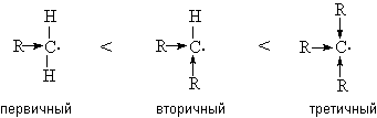 Состав продуктов замещения определяется относительной скоростью конкурирующих реакций, которая зависит от относительной реакционной способности связей С-Н (фактор реакционной способности) и от количества связей С-Н определенного сорта (статистический фактор). Установлено, что энергия разрыва связи С-Н уменьшается в ряду: перв -С-Н > втор -C-Н > трет- С-Н Этот ряд соответствует ряду относительной стабильности алкильных радикалов: