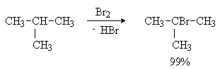Относительная скорость образования 2-метил-2-хлорпропана равна произведению числа участвующих в реакции (1) С-Н связей на их относительную реакционную способность: 1´ 7 = 7. Относительная скорость образования 2-метил-1-хлорпропана составит: 9´ 1 = 9. Рассчитаем содержание продуктов хлорирования в смеси: 2-метил-2-хлорпропана: 7/(7 + 9)´ 100% = 44% 2-метил-1-хлорпропана: 9/(7 + 9)´ 100% = 56% Таким образом, реакции хлорирования протекают неселективно с образованием смеси продуктов замещения. Бромирование алканов, в отличие от хлорирования, протекают региоселективно, так как радикалы брома обладают существенно меньшей реакционной способностью. Например, бромирование изобутана в таких условиях протекает с образованием исключительно 2-бром-2-метилпропана: