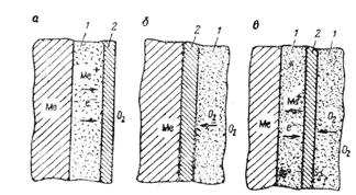 С чисто термодинамической точки зрения интенсивность протекания такого вида реакций зависит от химической активности металлов по отношению к кислороду. Например, алюминий по отношению к кислороду проявляет такую большую химическую активность, что отбирает его даже у воды, разлагая её (2Аl + 6Н2O → 2А1(ОН)3 +3Н2↑), если каким-нибудь способом разрушать образующуюся на поверхности алюминия окисную пленку. Как правило, в ходе данных химических реакций на поверхности металла образуются окисные пленки, затормаживающие химический процесс. Если образующаяся пленка получается рыхлой или порошкообразной, то в дальнейшем окисляются все новые и новые слои металла и сооружение (изделие) быстро разрушается. Если же на поверхности образуется сплошная плотная пленка, через которую не может проникнуть кислород, то химический процесс окисления прекращается сам собой. В этом случае пленка защищает металл от дальнейшего разрушения, т.е. пассивирует его. Так, например, происходит у алюминия - химический процесс сам себя тормозит. В общем случае использование металла в качестве конструкционного материала в данной окружающей среде возможно только в том случае, если процесс окисления достаточно заторможен. Для понимания процесса химической коррозии и разработки против нее эффективной защиты необходимо, прежде всего, знать механизм окисления металла и свойства окисной пленки. Толщина окисной пленки колеблется от 5-10 А до нескольких тысяч ангстрем. Окисная пленка может утолщаться только в том случае, когда через нее диффундирует кислород. Если ионы металла и принадлежащие им электроны диффундируют из железа через окисную пленку намного быстрее, чем кислород, то окисная пленка растет на границе газа и окисла (рисунок 3.а) в противном случае зона роста будет находиться под слоем окисла (рисунок 3.б). Если скорость диффузии ионов металла и кислорода не очень отличаются друг от друга, то зона роста располагается внутри окисной пленки (рисунок 3.в). Размеры ионов металла меньше (следовательно, скорость диффузии больше), чем молекула кислорода, поэтому окисная пленка обычно растет на поверхности, соприкасающейся с газом. Окисная пленка утолщается из-за диффузии. Её утолщение, в свою очередь, замедляет диффузию - коррозия уменьшается. Типы роста окисных пленок представлены на рисунке 3.