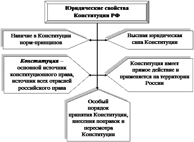1. Почему конституционное право называют ведущей отраслью системы российского права? 2. Назовите юридические свойства Конституции Российской Федерации и дайте им характеристику. 3. В чем выражается сущность Конституции Российской Федерации? 4. Охарактеризуйте структуру Конституции Российской Федерации. 5. В чем проявляется высшая юридическая сила Конституции Российской Федерации? 6. Расскажите о развитии Конституции Российской Федерации