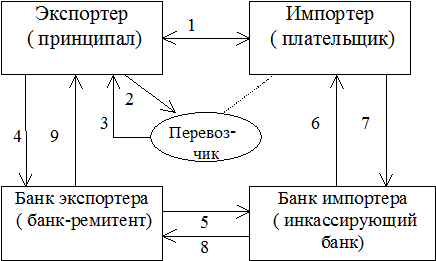 Под инкассо понимается осуществление банками операций с документами на основании полученных инструкций клиента, в результате которых плательщику передаются финансовые документы, не сопровождаемые коммерческими документами (чистое инкассо), либо финансовые документы, сопровождаемые коммерческими документами, либо только коммерческие документы (документарное инкассо) в целях получения платежа и (или) акцепта платежа или на других условиях. Инкассо осуществляется банком (банком-ремитентом) по поручению клиента (принципала) или от своего имени. В осуществлении операций по инкассо помимо банка-ремитента может участвовать любой иной банк (инкассирующий). Банк, представляющий документы плательщику, является представляющим банком. Под финансовыми документами понимаются: - векселя, - чеки, - иные используемые для получения платежа документы, выписанные в целях исполнения обязательств в денежной форме. Под коммерческими документами понимаются: - транспортные документы, - счета, - товарораспорядительные и иные документы, не являющиеся финансовыми. Инкассо считается международным, если одна из сторон, участвующих в расчетах по инкассо, является нерезидентом. Расчеты при экспортном инкассо осуществляются следующим образом (рисунок 2):
