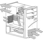 Тем не менее Intel считает, что система microATX вообще не нуждается в дополнительных системных вентиляторах, вероятно, исходя из предположения, что в этом форм-факторе собирают преимущественно маломощные офисные компьютеры. На схеме видно, что при отсутствующем вентиляторе воздух засасывается в корпус сзади так же, как и спереди. Однако, если есть возможность разместить вентилятор на задней панели, нужно ставить его на выдув, сориентировав поток в обратную сторону от его естественного направления, в противном случае мы получим систему с неоправданно большим импедансом и, как следствие, высокой температурой воздуха внутри корпуса.