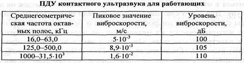 • v - пиковое значение виброскорости, м/с; • vo - опорное значение виброскорости, равное 5 • 10-8 м/с. Предельно допустимые величины нормируемых параметров контактного ультразвука для работающих приведены в таблице