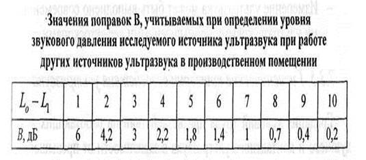 Lo - суммарный уровень звукового давления исследуемого (L) и остальных источников ультразвука (L1), дБ; Для оценки уровней звукового давления от одиночного источника ультразвука Измерения необходимо выполнять · не менее трех раз в каждой третьоктавной полосе для одной точки и затем вычислять среднее значение. · При измерении непостоянных уровней звукового давления отсчеты производят при типичном технологическом режиме, в течение которого уровень звукового давления достигает максимальных значений. · измерения проводят на постоянном рабочем месте или в рабочей зоне этого оборудования при выключенных остальных источниках ультразвука · При невозможности выключения остальных источников ультразвука оценка уровней звукового давления, создаваемого одиночным источником, производится по разности результатов измерений, полученных при работе остальных источников и выключенном исследуемом источнике Определение уровня звукового давления исследуемого источника ультразвука в этом случае осуществляется по формуле: В - поправка, определяемая по разности суммарного уровня Lo и уровня звукового давления остальных источников L, дБ, приведенная в табл.3 (поправки) на следующем слайде