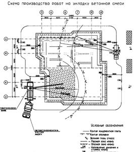 Рис.2 Схема производства работ при устройстве монолитной плиты 17-ти этажного жилого дома. Отказ – погружение сваи от одного удара молота в последнем залоге. Залог – 10 ударов молота или 1 мин вибропогружателя. Отказ сваи зависит от величины погружения сваи, несущей способности основания. В просадочных грунтах сваи погружаются не до отказа, а до проектной отметки. Рекомендуются следующие отношения массы ударной части молота к массе сваи: при использовании штанговых дизель-молотов и молотов одиночного действия не менее1,0-1,5; при трубчатых дизель молотов – 0,5-0,7. Различают следующие машины для свайных работ: копры (ударный способ), молоты (забивка, вибрационный, виброзабивка, вибровдавливание), машины для вспомогательных работ. Технические характеристики дизель-молотов (штанговые, трубчатые): наибольшая энергия удара (30-88 кДж), наибольшая высота подъема ударной части (3 м), масса ударной части(1800-5000 кг). Примеры: трубчатый дизель-молот С-996, копер КГ-12М. Технические характеристики копра КГ-12М: длина забиваемой сваи – 12 м; масса сваи – 12 м; сечение сваи 30x30-40x40 см; скорость подъема сваи и молота – 9,5 м/мин. Технические характеристики трубчатого дизель-молота С-996: высота молота – 4,19 м; высота подъема ударной части – 3 м; масса падающей части – 2,5 т; число ударов в минуту – 47-55. Выбор дизель-молота для забивки свай: 1.Определить необходимую минимальную расчетную энергию удара молота: