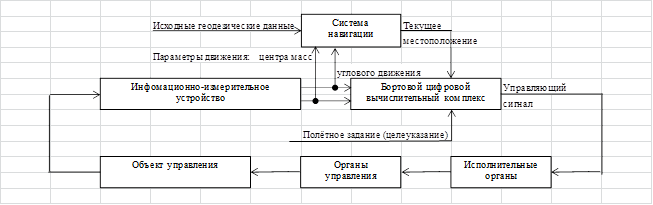 Полет БЛА по требуемой траектории обеспечивается с помощью системы управления. Система управления движением, размещенная на борту, включают в свой состав (рис.7.1): - информационно-измерительное устройство - комплекс информационно-измерительных приборов, обеспечивающий информацией о параметрах движения объекта системы навигации и стабилизации; - бортовой цифровой вычислительный комплекс (БЦВК) - комплекс аппаратно-программных средств, предназначенный для синтеза и реализации алгоритмов навигации и управления; - исполнительные устройства - рулевые приводы, предназначенные для исполнения команд управления БЦВК органами управления; - органы управления - аэродинамические, гидродинамические газодинамические, механические и др. рули, непосредственно формирующие управляющие силы и моменты сил для изменения линейного и углового движения подвижного объекта.