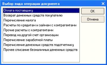 Рис. 7.2. Платежное поручение исходящее: выбор вида операции документа Здесь доступны следующие виды документов: • Оплата поставщику; • Возврат денежных средств покупателю; • Перечисление налога; • Расчеты по кредитам и займам с контрагентами; • Прочие расчеты с контрагентами; • Перевод на другой счет организации; • Перечисление заработной платы; • Перечисление денежных средств подотчетнику; • Прочее списание безналичных денежных средств; Для каждого из перечисленных типов документов используется схожая методика работы, которая различается лишь некоторыми деталями. Рассмотрим работу с исходящим платежным поручением, используемым для оформления оплаты поставщику, выбрав в окне выбора вида документа пункт Оплата поставщику. При открытии формы нового исходящего платежного поручения, часть реквизитов будет заполнена значениями по умолчанию (рис. 7.3).