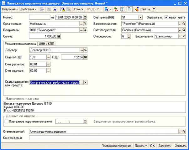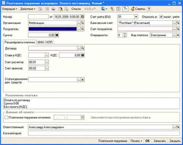 Рис. 7.3. Платежное поручение исходящее: форма документа Обратите внимание на флаг Отразить в налог. учете. Он отвечает за отражение документа в налоговом учете. Его установка предписывает системе формировать движения документа по налоговым регистрам, естественно, в том случае, если отражаемая документом операция важна для целей учета налога на прибыль. По умолчанию этот флаг установлен. В шапке документа автоматически заполнено название организации (поле Организация), заполнено поле Банковский счет, поле Счет учета (БУ) - здесь установлен счет 51. Очередность платежа установлена как 6, вид платежа - электронно. Если на расчетном счете организации недостаточно денежных средств, платежи удовлетворяются в соответствии с очередностью. Принята следующая очередность исполнения платежей в зависимости от их целей: • Списание сумм по исполнительным документам для возмещения вреда причиненного жизни или здоровью, а так же - алиментные платежи; • Списание по исполнительным документам, предусматривающим выплату выходных пособий, оплату труда; • Списание средств на оплату труда и перечисления в ПФ РФ, ФСС, ФОМС; • Платежи в бюджетные и внебюджетные фонды; • Другие исполнительные документы; • Списания по другим платежным документам в календарном порядке. На вкладке Расшифровка платежа выставлены счета учета расчетов (60.01) и авансов (60.02). Вкладка ИНН/КПП нужна для заполнения ИНН и КПП получателя и плательщика. Другие поля мы заполним следующим образом: Шапка документа: