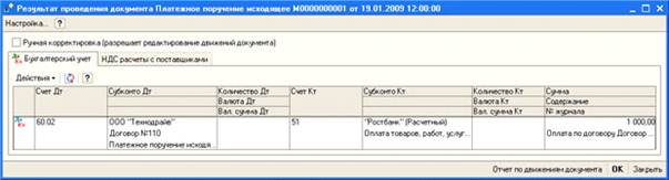 Рис. 7.4. Платежное поручение исходящее: заполненный документ После того, как мы заполнили исходящее платежное поручение, мы должны записать его, но не проводить. То есть - после заполнения нужно нажать на кнопку Записать. Для исходящих платежных поручений действует особый порядок записи и проведения. Когда мы только формируем, заполняем платежное поручение, мы не знаем точно, когда оно будет исполнено банком. Поэтому после заполнения поручения и передачи его в банк, мы можем узнать о том, было ли оно выполнено, лишь после получения выписки банка, в которой будет отражено списание средств по данному платежному поручению. Именно поэтому сформированный документ сохраняют в базе данных, не проводя. После того, как получена выписка банка с информацией о проведенной операции, мы открываем записанный ранее документ, устанавливаем флаг Платежное поручение оплачено, вводим в соответствующее поле дату исполнения поручения и лишь тогда проводим его, нажав на кнопку ОК в форме документа. Сформировать печатную форму документа можно, нажав на кнопку Платежное поручение. Запишем документ, после чего выставим в качестве даты оплаты поручения 19.01.2009 и проведем документ, нажав на кнопку ОК. Теперь рассмотрим бухгалтерские записи, которые сформировал документ. Для этого выделим его в списке документов Платежные поручения исходящие и нажмем кнопку Результат проведения документа (рис. 7.5).