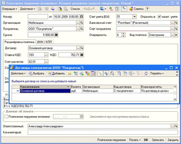 Рис. 7.5. Результат проведения документа Как видите, документ сформировал проводку вида Д60.02 К51 на сумму 1000 рублей -операция была классифицирована системой как выплата аванса поставщику. Прежде чем сформировать движения по подобному документу, система анализирует состояние расчетов с поставщиком. Эти расчеты учитываются на счете 60.01. Если оказывается, что на этом счете имеется кредитовое сальдо - система считает, что проводимый платеж - это погашение задолженности перед поставщиком. Если сальдо нет - платеж оформляется как аванс и учитывается на счете 60.02. Мы рассмотрели процедуру создания платежного поручения для перечисления денежных средств поставщику. Выше мы говорили о том, что в системе существует несколько видов платежных поручений. Заполнение каждого из видов имеет некоторые особенности. Например, при выборе вида документа Возврат денежных средств покупателю, реквизиты документа очень похожи на реквизиты вышеописанного документа, однако важно отметить, что в качестве договора нужно указывать договор вида С покупателем (рис. 7.6).