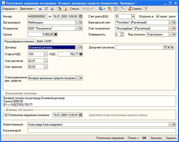 Рис. Платежное поручение исходящее: возврат денег покупателю Так же здесь указаны субсчета счета 62 "Расчеты с покупателями и заказчиками" как корреспондирующие со счетом 51. Поле Документ расчетов нужно заполнять лишь в том случае, если расчеты по договору с покупателем ведутся отдельными расчетным документами. На рис. 7.7 вы можете видеть заполненное платежное поручение на возврат денежных средств покупателю. Мы сразу указали дату выполнения платежа, и, нажав ОК, проводим документ.