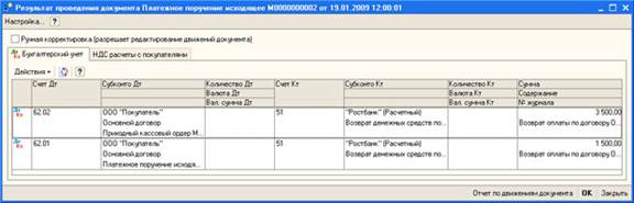 Рис. 7.7. Заполненное платежное поручение исходящее: возврат денег покупателю Посмотрим, какие проводки сформировал только что проведенный документ (рис. 7.8).