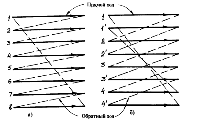 Видеосистема ПЭВМ основана на растровом принципе вывода изображений и текста. Растровый принцип заимствован из телевидения и подразумевает, что некий рисующий инструмент, способный оставлять видимый след, сканирует всю поверхность, на которую выводится изображение. Траектория движения инструмента постоянна и не зависит от выводимого изображения, но инструмент может рисовать, а может и не рисовать отдельные точки траектории. Видимым изображением являются оставленные инструментом точки. В случае видеомонитора на базе ЭЛТ инструментом является модулированный по яркости электронный луч (или три луча базисных цветов – R-красный, G-зелёный, B-синий), построчно сканирующий экран и вызывающий свечение люминофора, нанесённого на внутреннюю поверхность экрана ЭЛТ. Каждая строка растра разбивается на некоторое количество точек – пикселей, засветкой каждой из которых по отдельности может управлять устройство, формирующее изображение (например, графическая карта). Видеомонитор является растровым устройством вывода динамически изменяемых изображений. Его луч сканирует экран с частотой, которая не должна позволять глазу пользователя видеть мерцание изображения. Матричные (плоские) экраны, применяемые в мониторах, также относятся к растровым устройствам. Сканирование экрана модулированным лучом обеспечивается генераторами горизонтальной ( строчной ) и вертикальной ( кадровой ) развёрток монитора – аналогично развёрткам в телевизоре. Электронный луч может оставлять след только во время прямого хода по строке (слева направо). Строка разбивается на некоторое количество точек разложения, каждая из которых может иметь состояние (яркость и цвет) независимое от других точек. На обратном ходе по строке луч принудительно гасится. Следующая строка прорисовывается параллельно предыдущей строке, но с некоторым вертикальным смещением (вниз), и так происходит сканирование до окончания кадра – достижения правого нижнего угла экрана. Во время обратного хода луча по вертикали, за время которого генератор горизонтальной развёртки успеет сделать несколько строчных циклов, луч также принудительно гасится. В следующем кадре сканирование может происходить по-разному. В системах с прогрессивной (или не чередующейся) развёрткой), луч в следующем кадре идёт по тем же строкам (Рис. 6. а). В системах с чересстрочной (или телевизионной) развёрткой, луч пройдёт по строкам, смещённым по вертикали на половину шага строки (Рис. 6. б). В этом случае всю поверхность экрана луч проходит за два цикла кадровой развёртки, называемых полукадрами. Этот способ позволяет почти вдвое снизить частоту горизонтальной (строчной) развёртки, а, следовательно, и темп выдачи точек изображения на экран. Как известно, глаз является инерционным органом зрения – он воспринимает изменение яркости или освещённости только до какой-то определённой частоты. Существует понятие критической частоты световых мельканий, которая обеспечивает слияние мельканий в ровный свет. Эта частота может находиться для разных людей в пределах 40-60 Гц. Поэтому минимальная частота кадров выбирается 60 Гц.